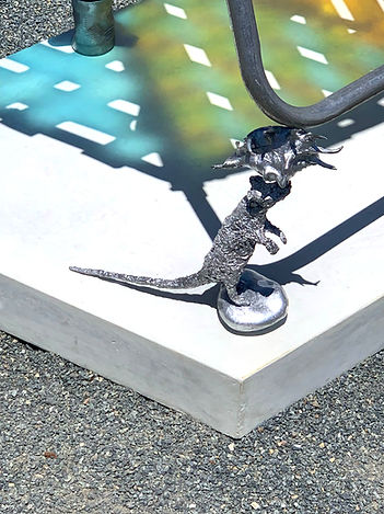 Kelly Wall Time After Time July-August 2024 Los Angeles is a city of fantasy and illusion - a place where nostalgia is currency and product. Kelly Wall's cheeky sculptural practice engages both earnestly and ironically with this manufactured emotion. Wall has created a series of works for VSF’s courtyard that draw on that ultimate backyard icon: The folding, basketweave vinyl lawn chair. Replacing the delicate vinyl with woven stained glass and augmenting the aluminum structure of the chair to create morphing, multiplying shapes - no longer suitable for sitting - Wall's work suggests a campsite or party that happened last night, the mix and scramble of social interactions leaving their residue as objects. Alongside these colorful chairs, a collection of cast aluminum objects amplifies the impression that something happened here. Crushed cans, kitschy ash-trays, little rodents, and impossibly intertwined mugs form sundial-like circles around the chairs, and a cosmology of enchanting detritus across the ground. Every object conveys a sense of time that has passed, both recently and long in the rearview. A heart-shaped ash-tray, emblazoned in corny script with the word love on one side, and strife the other, is aptly titled Empodocles' cycles, nodding to the pre-Socratic philosopher's theory that the forces of love and strife are the push and pull forces of the world.